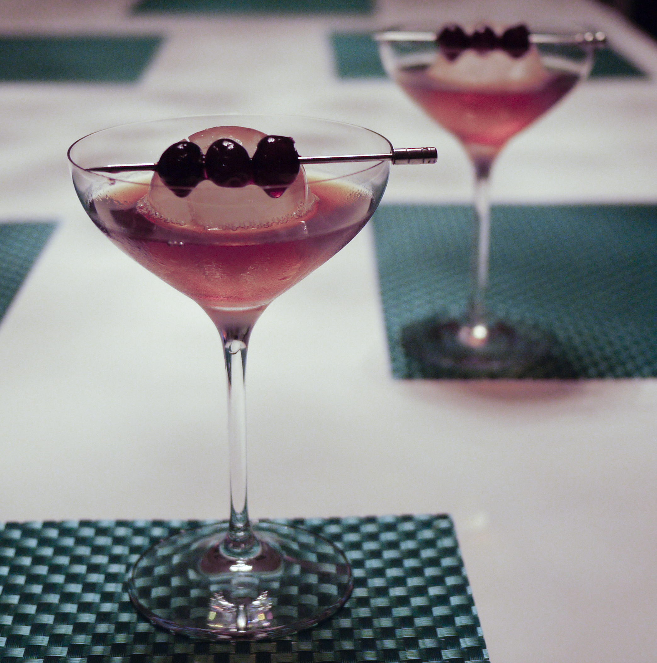 Stir ingredients in a shaker with ice. Pour into a champagne coupe with (optional) ice sphere. Garnish each drink with three cherries.