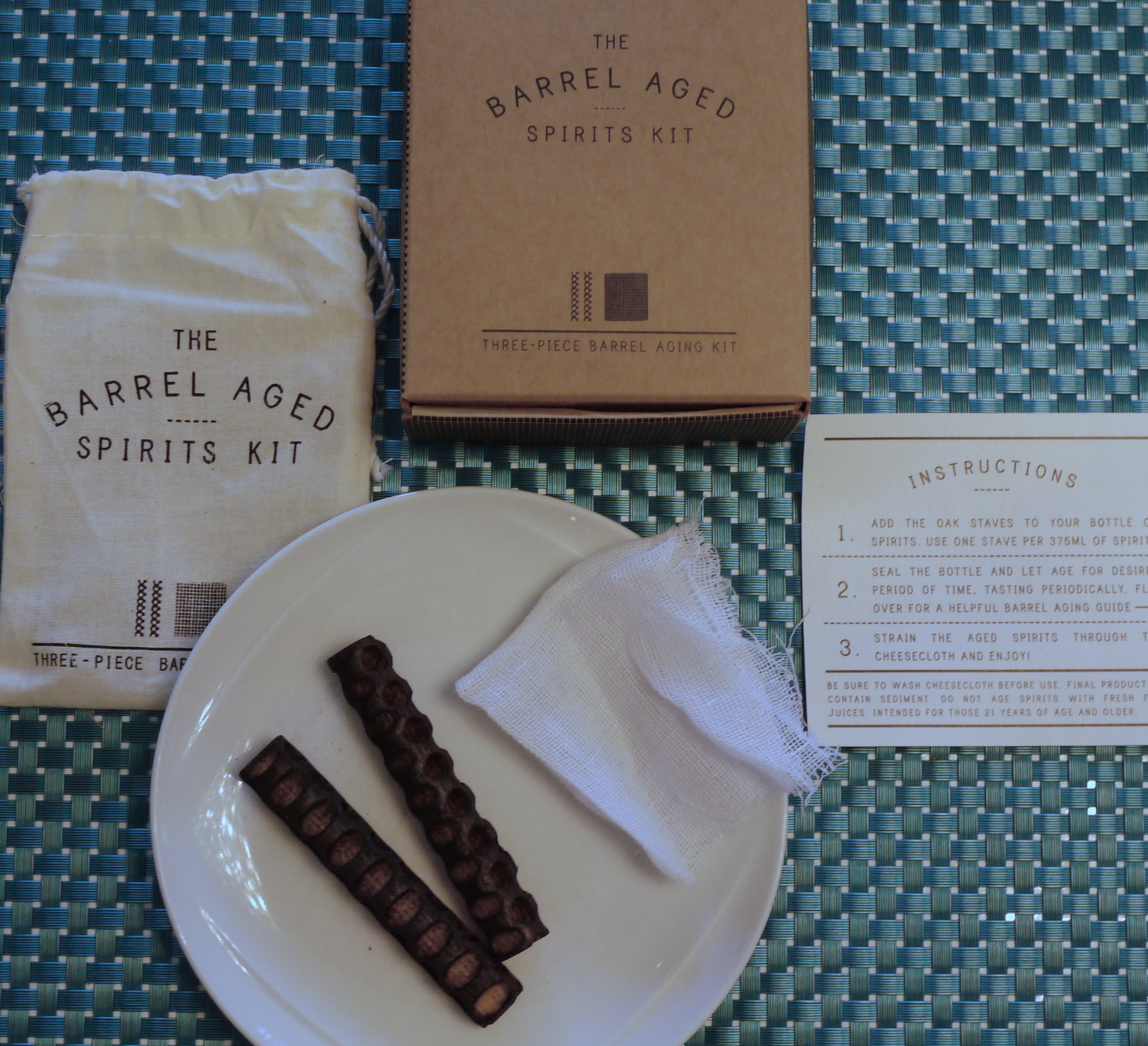 At Sur La Table we found a barrel-aged cocktail kit, which is essentially two charred oak staves and a piece of cheese cloth (shown below). We made a batch of our Negroni cocktail and aged it in a bottle with one of the staves for seven days. It ended up tasting woodier, more complex, and slightly sweeter and smoother — definitely a different cocktail than the regular Negroni. We’ve also ordered a small oak barrel so we can make real barrel-aged cocktails; stay tuned for the results.