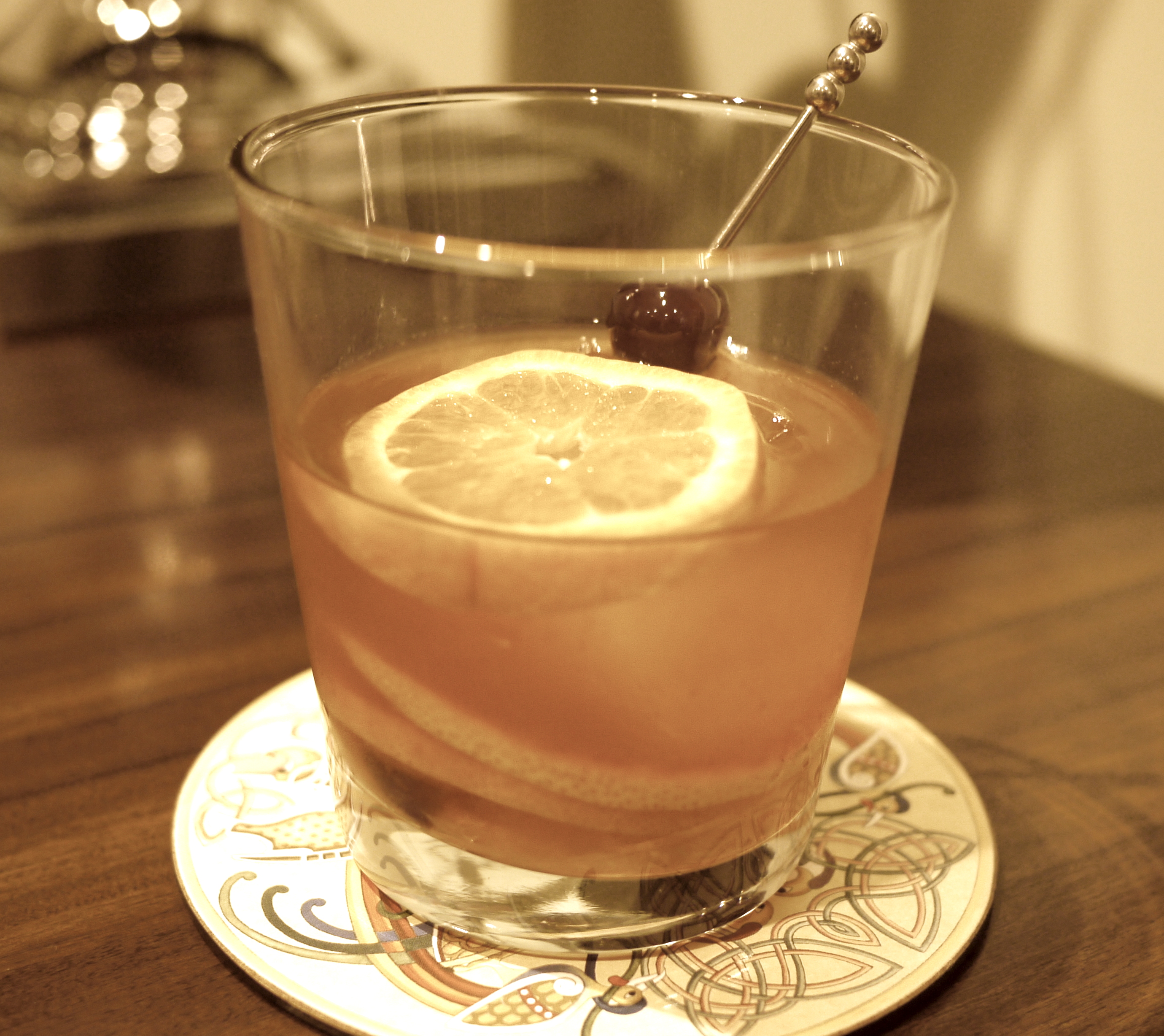 - Orange slice and black cherry for garnish
