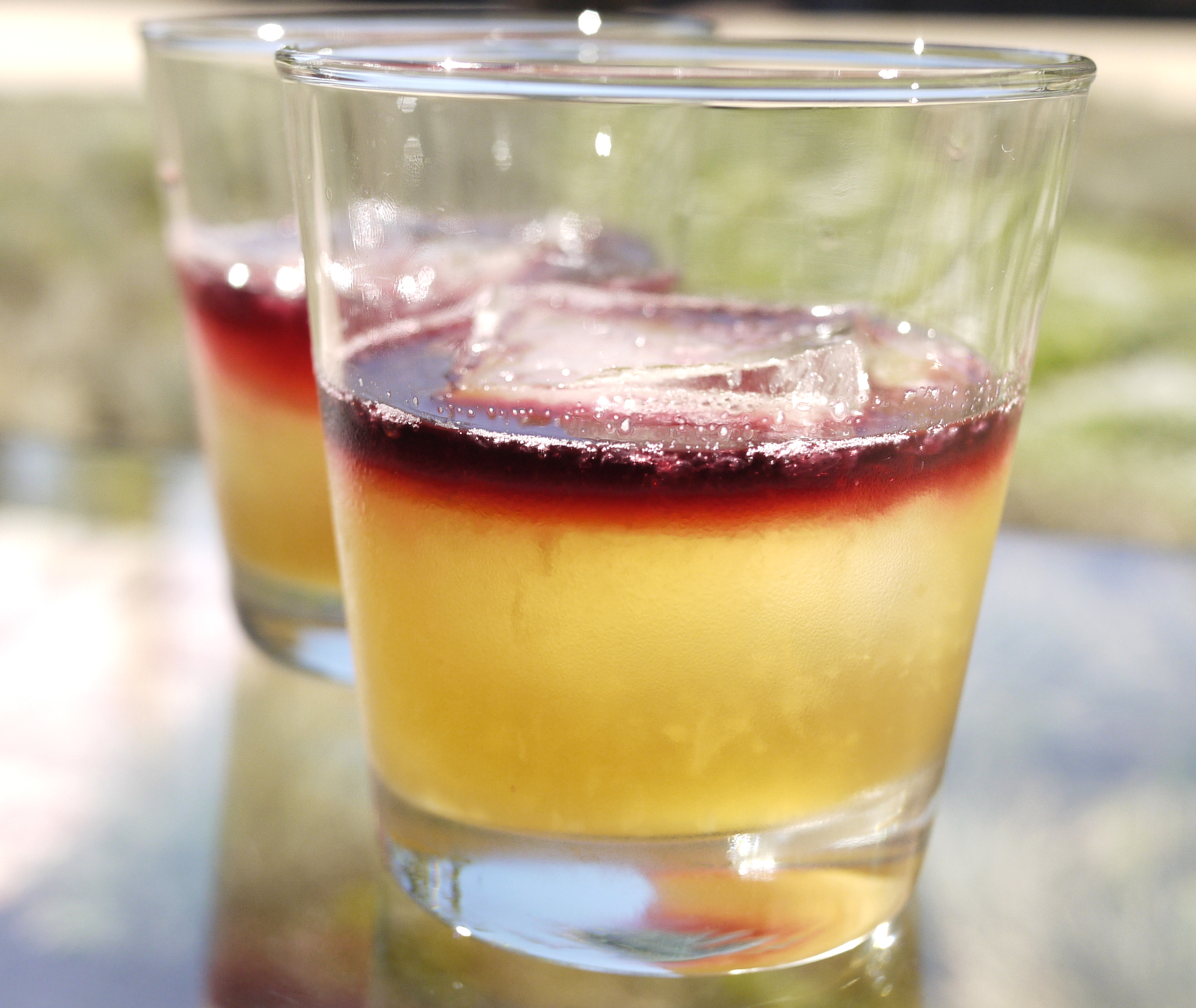 We spent the weekend wine tasting in the Santa Ynez Valley, so it seemed appropriate to make a cocktail involving wine. The New York sour is essentially a whiskey sour with a float of wine on top. It’s an old recipe: apparently it dates to the late 19th century and was invented in Chicago before becoming popular in New York. It’s not only a beautiful drink, but a surprisingly good one. There’s a synergy of oak, maple, vanilla, and fruit flavors from the bourbon, wine, and maple syrup. You can enjoy it as-is or stir it up; we prefer it without stirring.